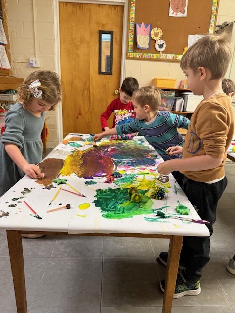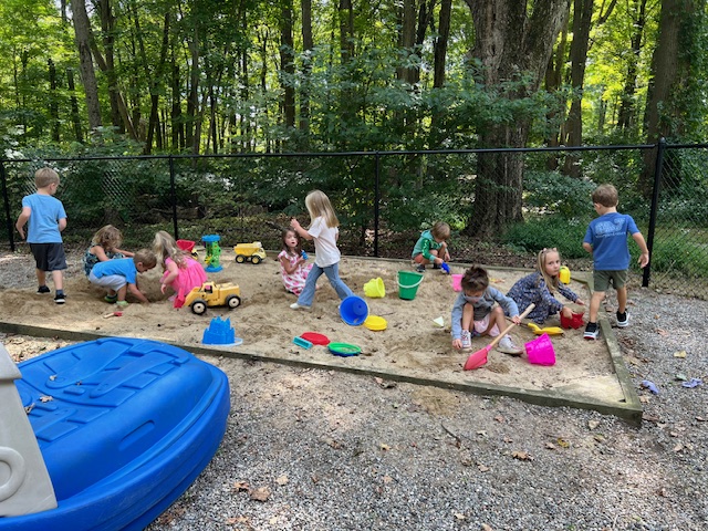 After clean-up time, we explore our theme further through an art project, group game, listening activity or readiness exercise. Here, children reinforce language and social skills as well as readiness skills for kindergarten. We introduce colors, shapes, numbers, and letters in a fun filled way! Hands are washed and then it is lunch time. While we encourage children to use the bathroom during the session as needed, they are reminded to use it again at this time. We give thanks, sing songs, and EAT! After lunch, we play outdoors. We will go outside every day unless it is below 40 degrees, raining or snowing. Our fenced playground provides a stimulating, safe arena for large motor development and exploration. We also explore in the sand with diggers and sand toys and dig for treasures. On special days, we ride bikes on protected areas of the blacktop. Negotiating skills flourish; taking turns on bikes, swings, climbers, and slides. We close our program with a story or independent book time. All projects and notices will be clipped on our hallway “clotheslines” after each session.